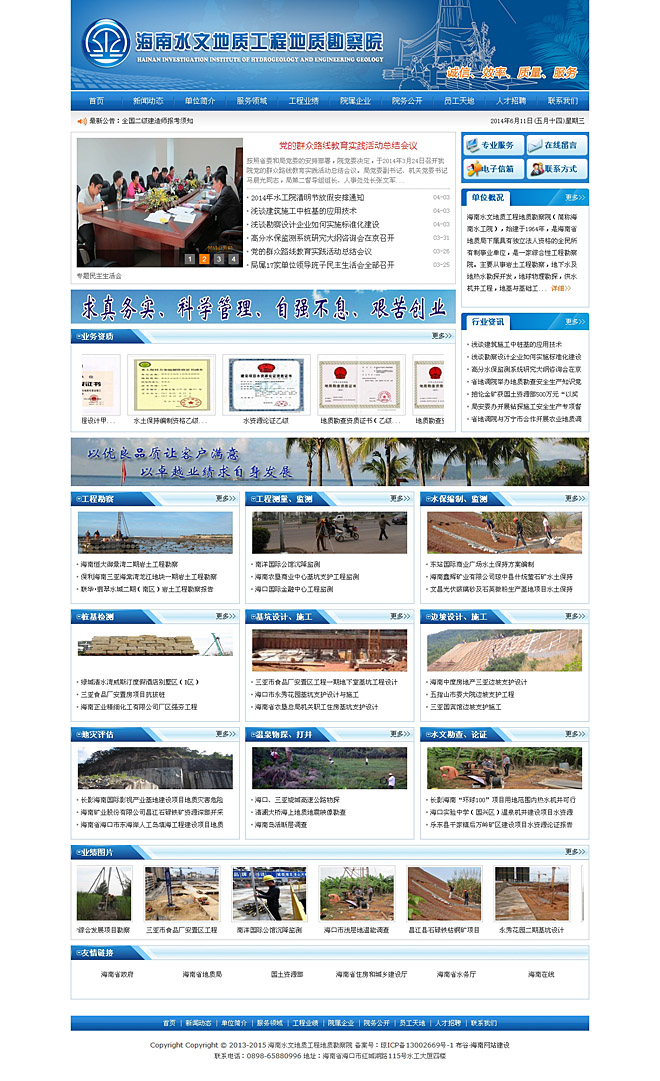 海南水工院業(yè)務(wù)范圍廣泛,專業(yè)結(jié)構(gòu)合理,技術(shù)力量雄厚,實踐經(jīng)驗豐富。建院50年來,先后完成巖土工程勘察、水文地質(zhì)勘查、地基與基礎(chǔ)工程施工、巖土工程施工與治理、地下水研究、地質(zhì)災(zāi)害評估、地形測量、測繪遙感、物探測試等項目2000余項。曾榮獲地礦部找礦一等獎;國家科委科技進(jìn)步三等獎;廣東深科委科技進(jìn)步一、三等獎;海南省優(yōu)秀工程勘察二、三等獎和??谑袃?yōu)秀工程勘察項目一等獎;并連續(xù)多年榮獲海南省勘察設(shè)計綜合實力三十強單位稱號,為海南的開發(fā)艱澀事業(yè)做出了突出貢獻(xiàn)。我院堅持以市場為導(dǎo)向、以科技為支撐、以質(zhì)量為生命、以效益為中心,秉承“質(zhì)量第一,顧客至上”的服務(wù)宗旨,以“誠信、效率、質(zhì)量、服務(wù)”為立院之本,務(wù)實進(jìn)取,追求竭誠為社會各界人士服務(wù)。