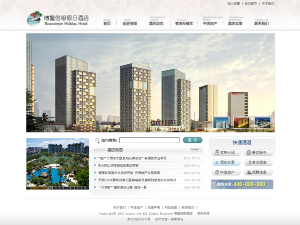 日前,博鰲信銀酒店委托我司建設(shè)酒店宣傳網(wǎng)站。 據(jù)了解, 瓊海博鰲信銀假日酒店是由中信銀行獨(dú)資公司設(shè)立,主要為本銀行系統(tǒng)內(nèi)中小型銀企會(huì)議和員工及銀行客戶的休假提供服務(wù)。